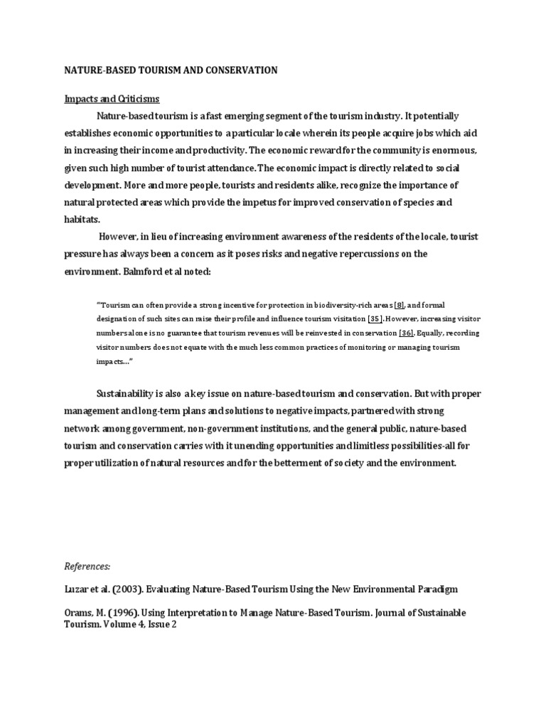 Overview why to study. We focus on 1 trends and patterns in naturebased tourism and tourist infrastructure in these pas. Tourism that has minimal impact on fragile natural environments and which focuses on providing nature based experiences.